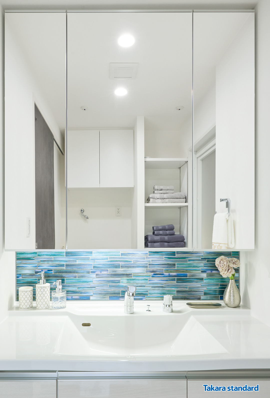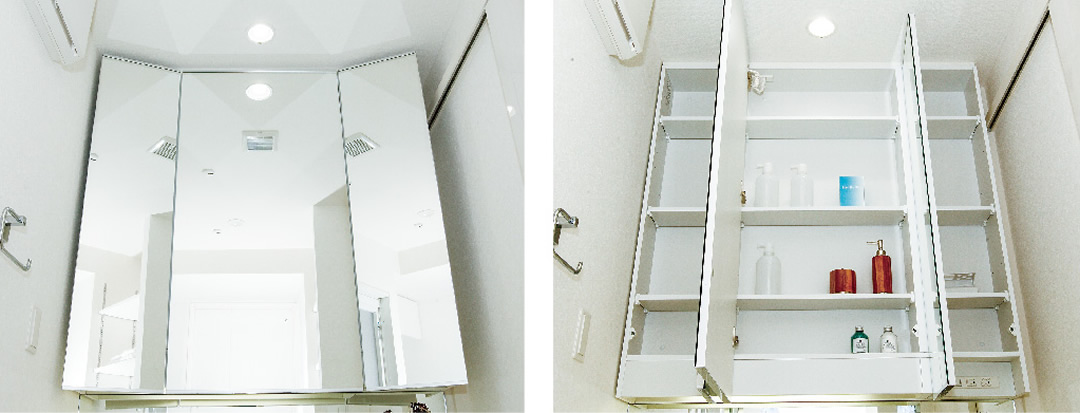 大型の三面鏡は女性に人気、中央のミラーはくもり止め機能付です。鏡の背面には大容量の収納とコンセントを設置。コスメ用品やリネン類を収納できます。