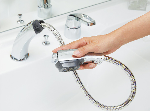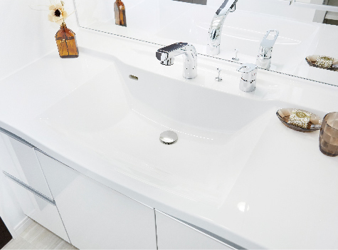 清潔感あふれる上品な洗面化粧台を採用。大型の三面鏡は背面にコンセントがある収納スペースになっており、化粧品などの小物類もスッキリと整頓できます。天板とボウルは一体型の美しい人工大理石製。蛇口はシャワーノズル式で引き出せるので、お掃除にも便利です。