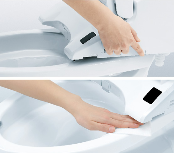 ワンプッシュで「ウォシュレット」前方が持ち上がり、汚れがたまりやすい便器とのすき間もラクにお掃除できます。